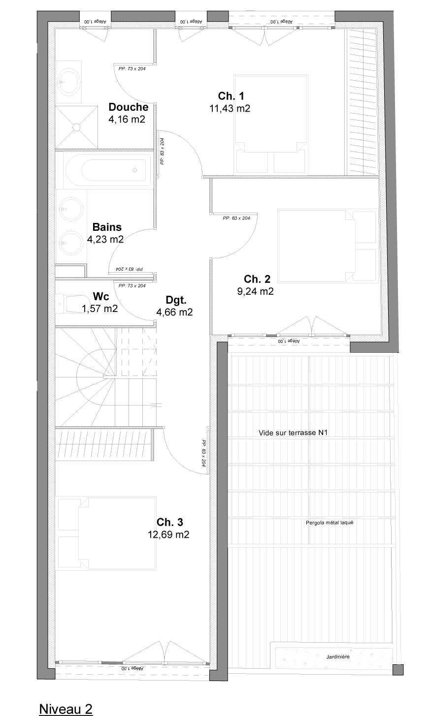 Au second niveau, 3 chambres, dont une avec douche, un bain, un WC et un dégagement.